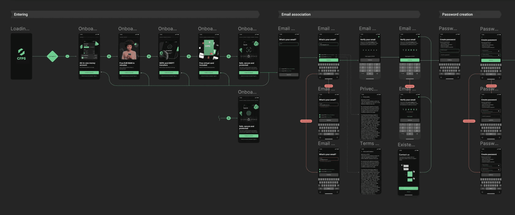 I mapped detailed user flows for critical features — account registration, KYC verification, card issuance, transfers, and transaction management — identifying decision points, error states, and regulatory requirements at each step.