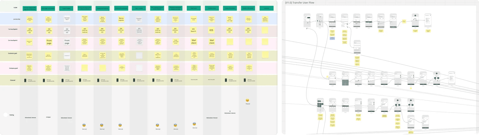 Based on research insights, I mapped critical user journeys and defined the MVP scope for the mobile app: essential banking functionality without feature bloat. Three flows needed to work flawlessly – account onboarding and KYC verification, money management and transfers, and card issuance with controls.