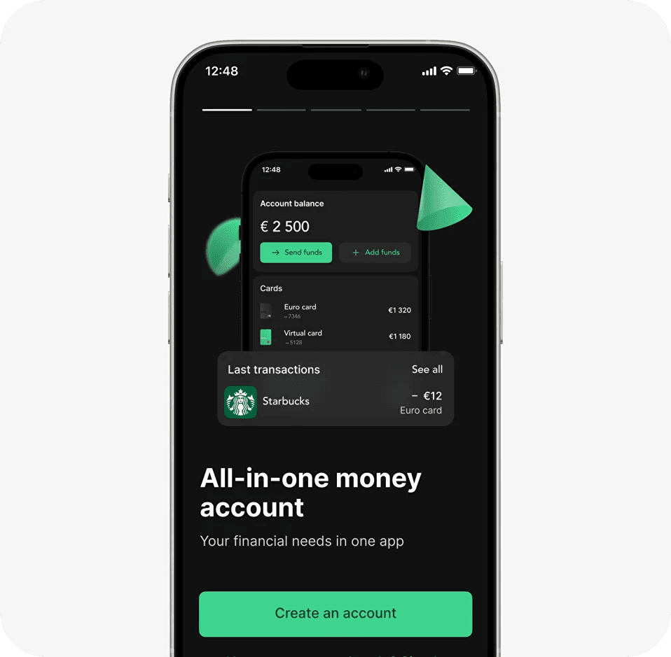 Free IBAN account with Mastercard, real-time spending notifications, instant transfers within SEPA zone, budget management tools.